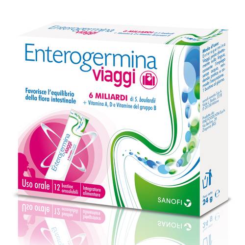 Enterogermina viaggi Integratore alimentare a base di 6 Miliardi di S. boulardii, Vitamina A, D e Vitamine del gruppo B, arricchito con fibre prebiotiche, in bustine orosolubili da assumere senza acqua, pratiche da portare con sé durante viaggi o vacanze. Il S. boulardii è un probiotico che aiuta ad equilibrare la flora intestinale, favorendone il regolare funzionamento. Essendo resistente alle alte temperature, non necessita di conservazione in frigorifero ed è quindi adatto ad essere portato con sé durante viaggi o vacanze. La Vitamina A aiuta il regolare funzionamento del sistema immunitario. La Vitamina D contribuisce al ma...